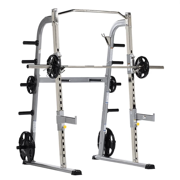 TuffStuff’s Evolution Half Cage (CHR-500) is specially designed with a 7-degree slant, providing easier loading and unloading of the weight bar, and freedom of body movement. The Evolution Half Cage system comes with integrated safety stoppers, a built-in chinning bar, dip handles, spring loaded/swing lock J-Hooks, Olympic bar holder and weight plate storage.