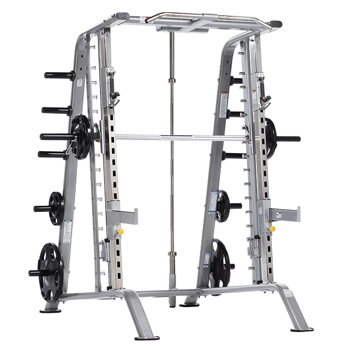 Featuring a 7-degree slant Smith system with oversized aluminum bar (starting weight 28 lbs.) for easy gripping, built-in plate storage and a welded pull-up station. These features, combined with a free-weight half rack makes the CSM-600 perfect for the serious lifter.